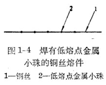 若采用銅或銀做熔體,由于電阻率小,可以做成小截面的熔體,但它們的烙化點比較高(1080℃和960℃),對于這種熔體降低熔化點的有效措施是利用冶金效應,即在銅和銀制成的熔絲上焊上低熔點的金屬小珠(如用鉛或錫,實臉證明采用錫比鉛效果好),如圖1-4所示。當銅絲(或銀絲)上的溢度稍大于低熔點的金屬小珠溫度時,此金屬小珠即熔化,使焊接小珠部分的銅絲(或銀絲)也逐漸熔化,造成很多斷點,并產生電弧;當電弧燃燒到一定長度不足以維持電弧繼續燃燒時,電弧熄滅,電路斷開。此外,尚有其他一些降低熔休熔化溫度的方法,例如采取分段用錫等措施。